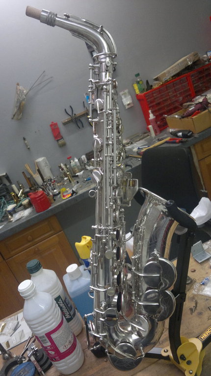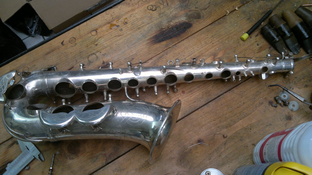 Il a fallu extraire tous les axes, les refabriquer, retamponner, relièger, régler et découvrir son timbre. Car tout étant grippé, c'était l'inconnu..et bien ca sonne !! il faut juste apprivoiser le clétage.